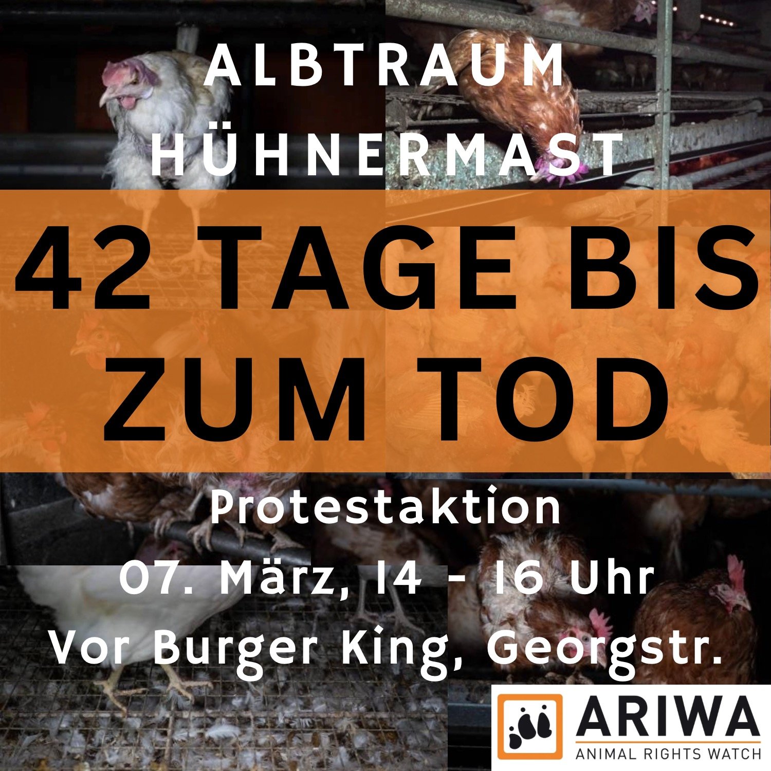 Wir klären auf über die Gefangenschaft auf engstem Raum unter Zehntausenden, über das monotone Dasein, das sie in Dreck und Gestank fristen müssen, und über den brutalen Tod, den sie erleiden, nur um als Ware auf unseren Tellern zu landen.