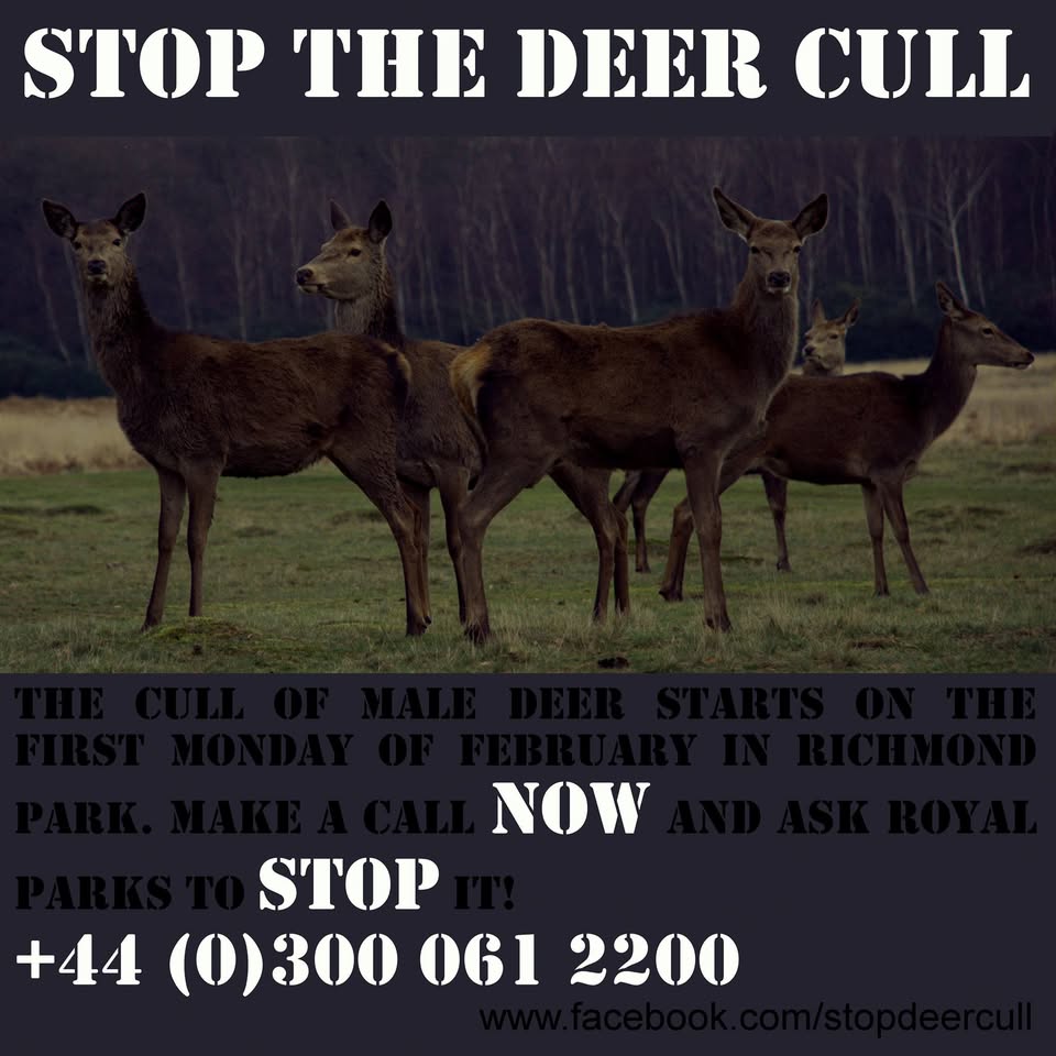 Meet by the Stockyard on Hampton Court Road (TW12 2EJ) to protest the Royal Parks deer cull and the alternatives such as spaying female deer (this has worked well in Ohio, see this site for info cliftondeer.org ). Signs to hold and flyers to hand out will be provided.