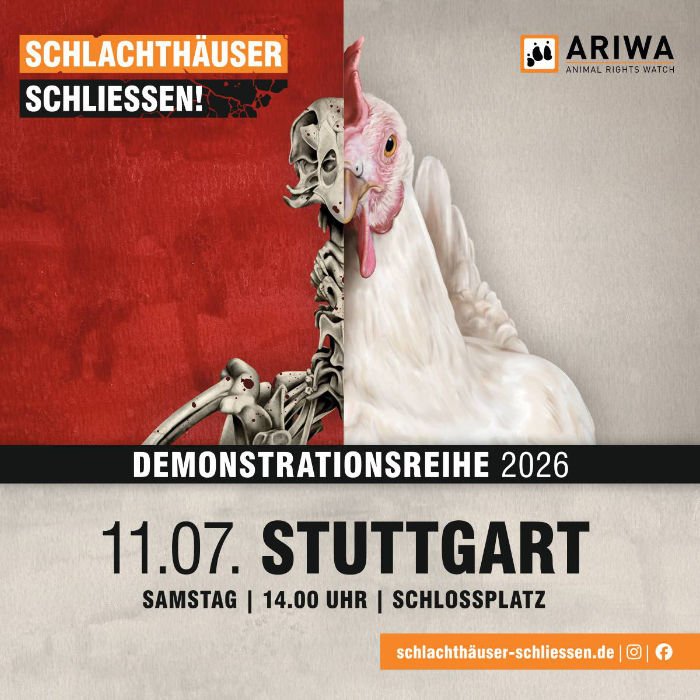 Wie jedes Jahr wollen wir auch 2026 gemeinsam für Tierrechte demonstrieren. Mit einem großen und lautstarken Demozug ziehen wir durch Stuttgart. Sei dabei!