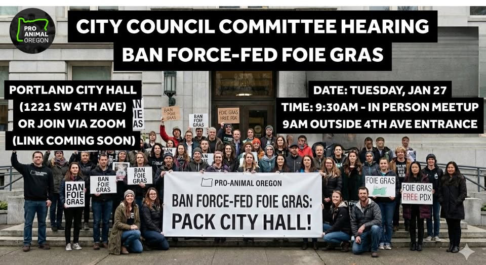 Portland’s Arts & Economy Committee has a tentative hearing date for the proposed foie gras ban, and this is our moment to show up for animals.