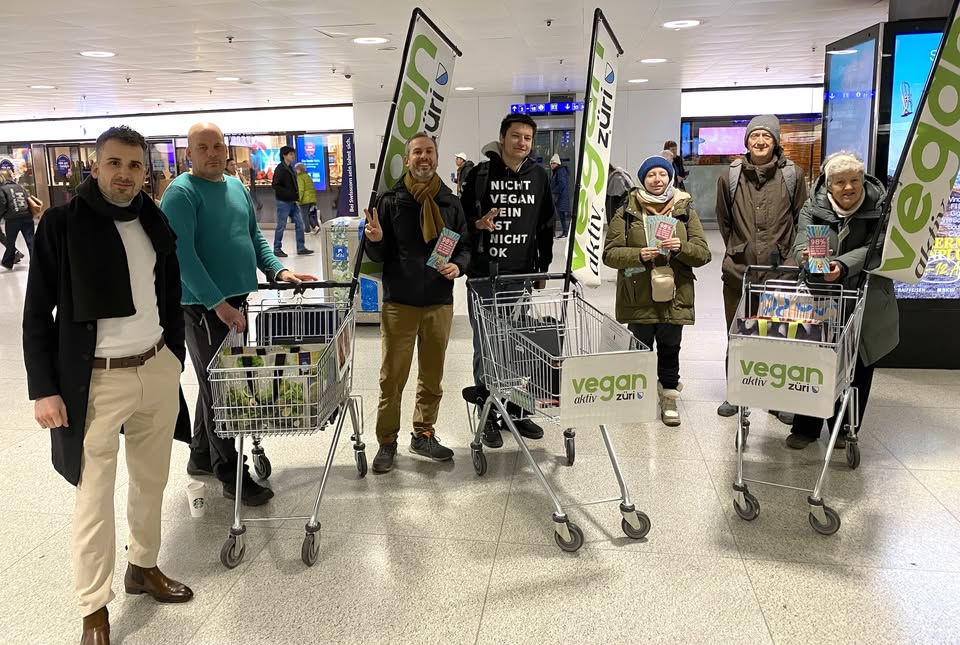 Vegan Aktiv Züri flyert am Hauptbahnhof und sucht das Gespräch mit interessierten Passant*innen.