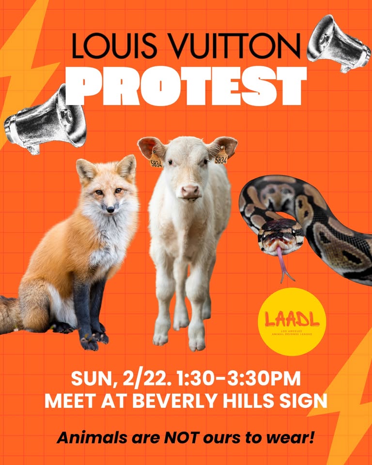 Animal cruelty is never a cute look. We’re returning to Loser Vuitton to remind them that whether it’s cow/python skin (aka leather), fur, feather, or wool, no animal should suffer for a piece of ugly clothing.