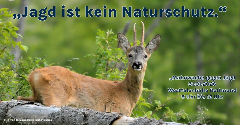 Parallel zur größten europäischen Jagdmesse „Jagd & Hund“ findet am 31. Januar 2026 eine Mahnwache gegen Jagd vor den Westfalenhallen Dortmund statt.