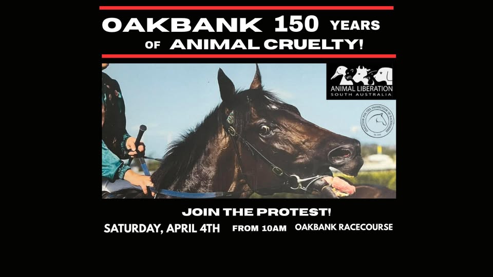 OAKBANK is celebrating 150 years of horse racing (animal exploitation and cruelty) this year. We will be there to pay our respects to the many innocent souls who have suffered and died along the way - and, of course, to remind the public why this cruel industry must end!