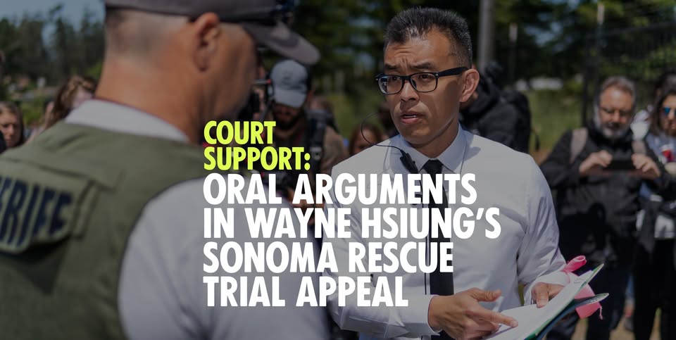 Please join us Thursday, April 23rd 10am at 350 McAllister St, San Francisco for court support in the oral arguments of Wayne Hsiung’s appeal of his felony conviction in his Sonoma County rescue trial. Esteemed legal scholar Justin Marceau will deliver arguments on Wayne’s behalf.