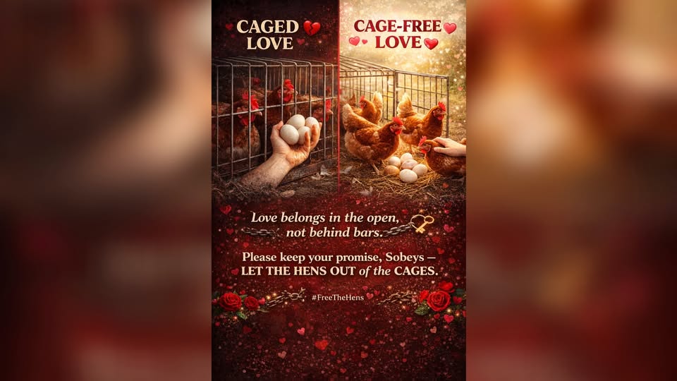 Join Mercy For Animals volunteers this Valentine’s Day to stand up for love, compassion, and the millions of hens still trapped in cages in Sobeys’ egg supply chain . We are urging Sobeys to publish a clear, time-bound plan to fulfill their long-overdue promise to eliminate extreme confinement for hens — a promise first made in 2016.